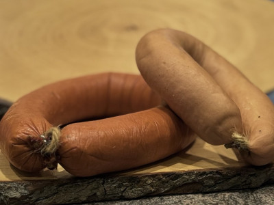 Das Foto zeigt eine Krakauer und eine Fleischwurst im Ring. Die Krakauer wirkt kräftig geräuchert. Die Fleischwurst hat eine glatte, helle Hülle. Beide eignen sich gut für einen Imbiss. Die Produkte lassen sich warm oder kalt essen. Die natürliche Bindfaser an den Enden signalisiert Handwerk.